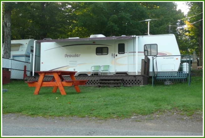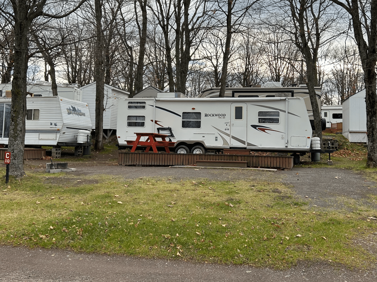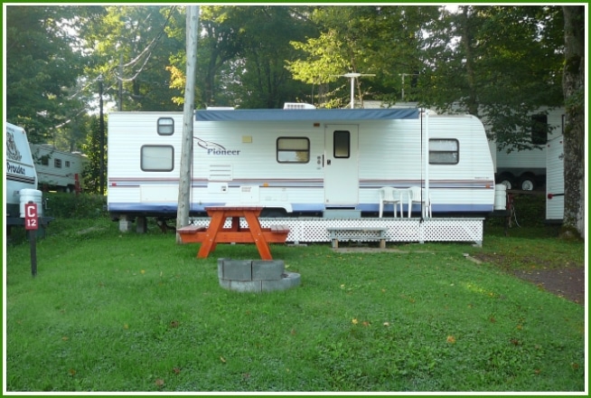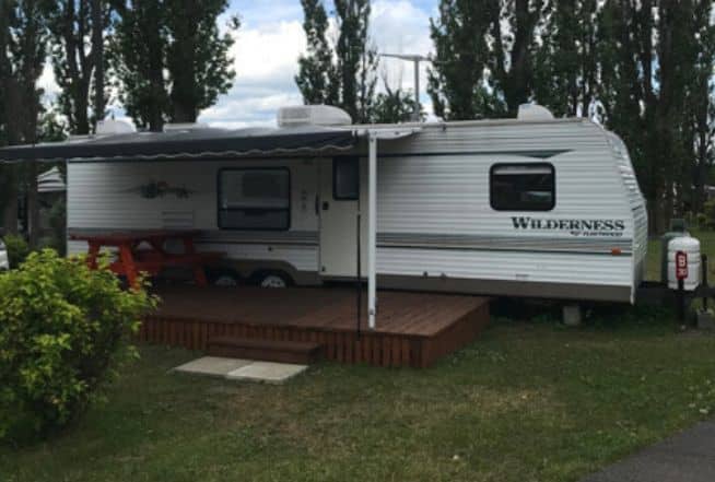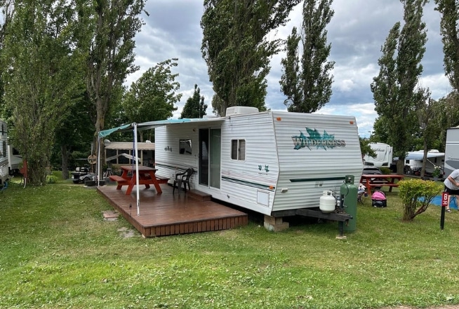 Roulotte Rockwood 2006 – 30 pieds, située sur un terrain moyen, semi-ombragé et tranquille.