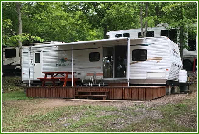 Roulotte Wildernes 2003 – 30 pieds, située dans un endroit grand, ombragé et tranquille.